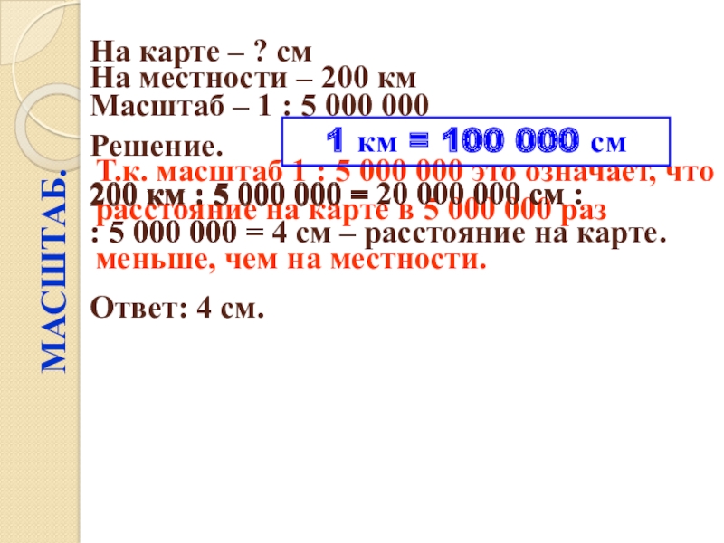 200 км : 5 000 000 = 20 000 000 см : : 5 000 000 = 4 см – расстояние на карте.