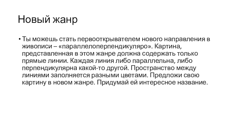 Картина, представленная в этом жанре должна содержать только прямые линии. Каждая линия либо параллельна, либо перпендикулярна какой-то другой. Пространство между линиями заполняется разными цветами. Предложи свою картину в новом жанре. Придумай ей интересное название.