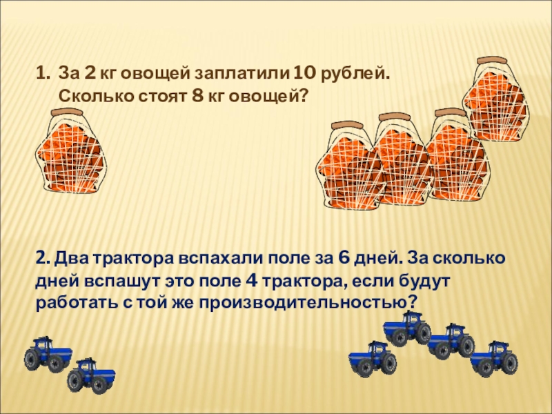 2. Два трактора вспахали поле за 6 дней. За сколько дней вспашут это поле 4 трактора, если будут работать с той же производительностью?