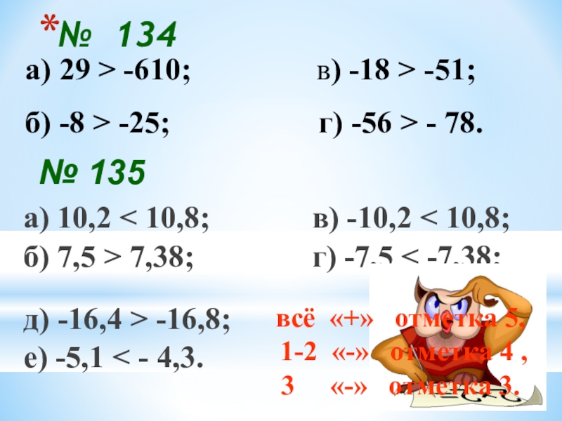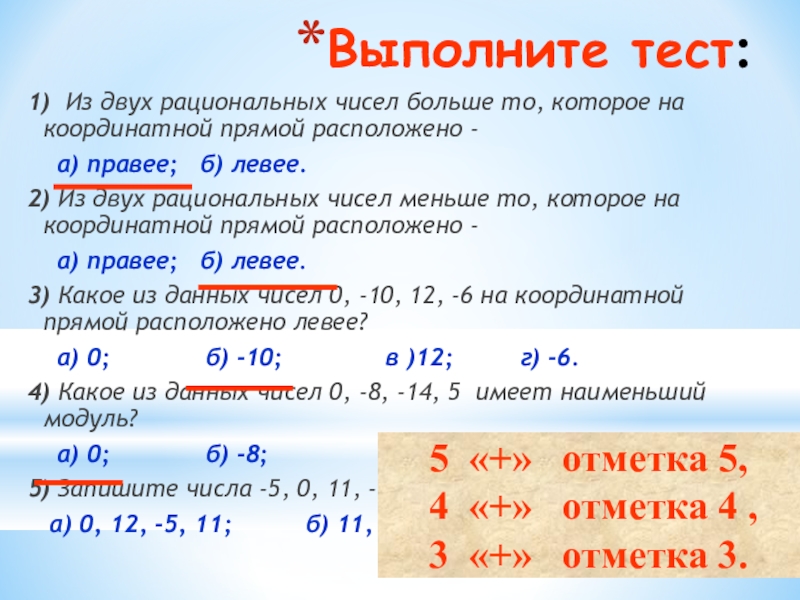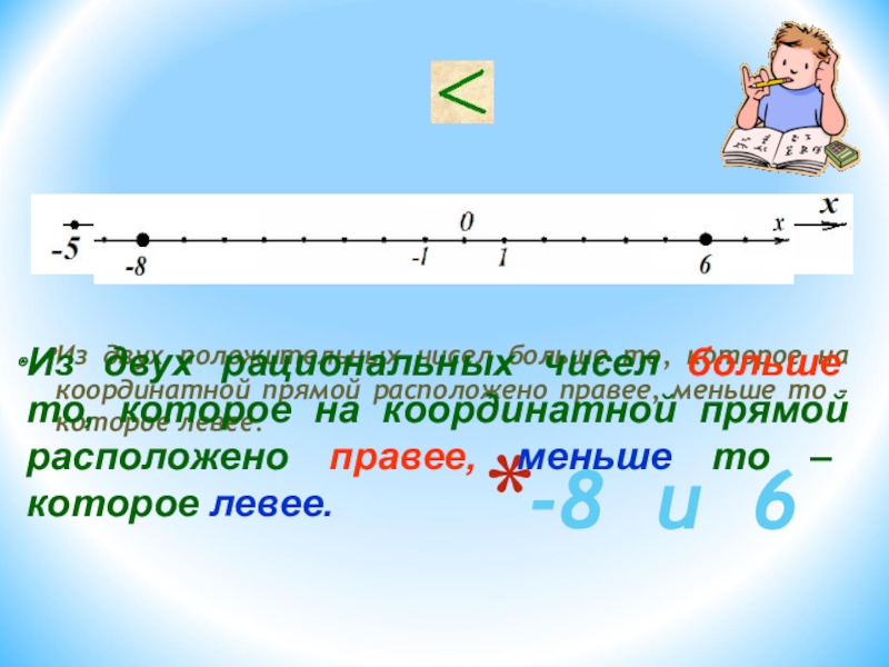 Из двух рациональных чисел больше то, которое на координатной прямой расположено правее, меньше то – которое левее.