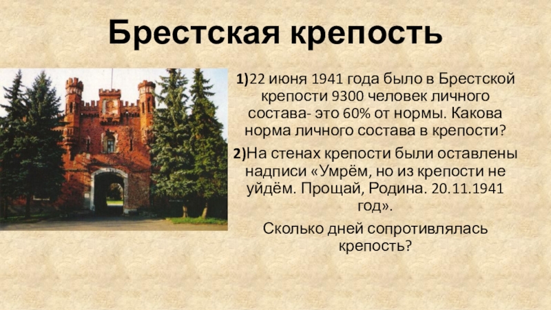 2)На стенах крепости были оставлены надписи «Умрём, но из крепости не уйдём. Прощай, Родина. 20.11.1941год».