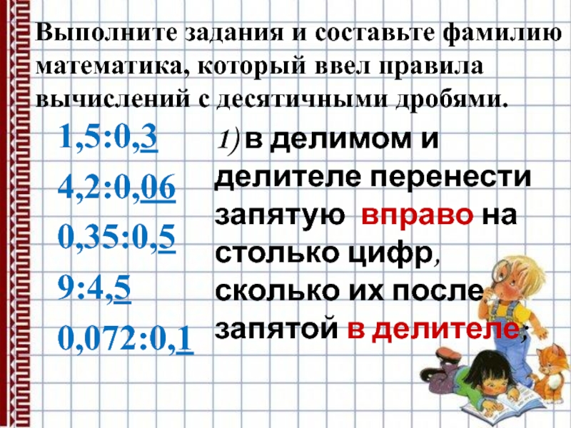 Выполните задания и составьте фамилию математика, который ввел правила вычислений с десятичными дробями.