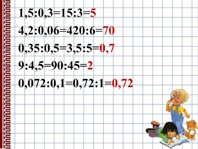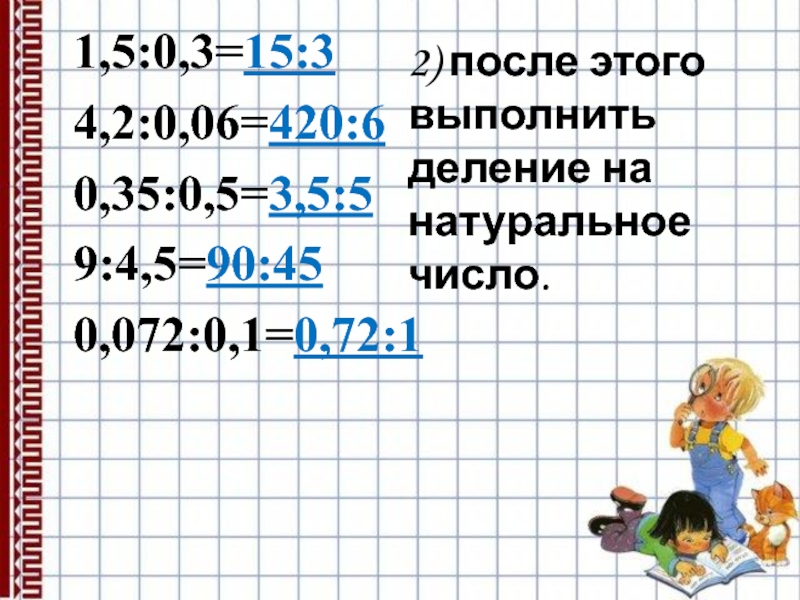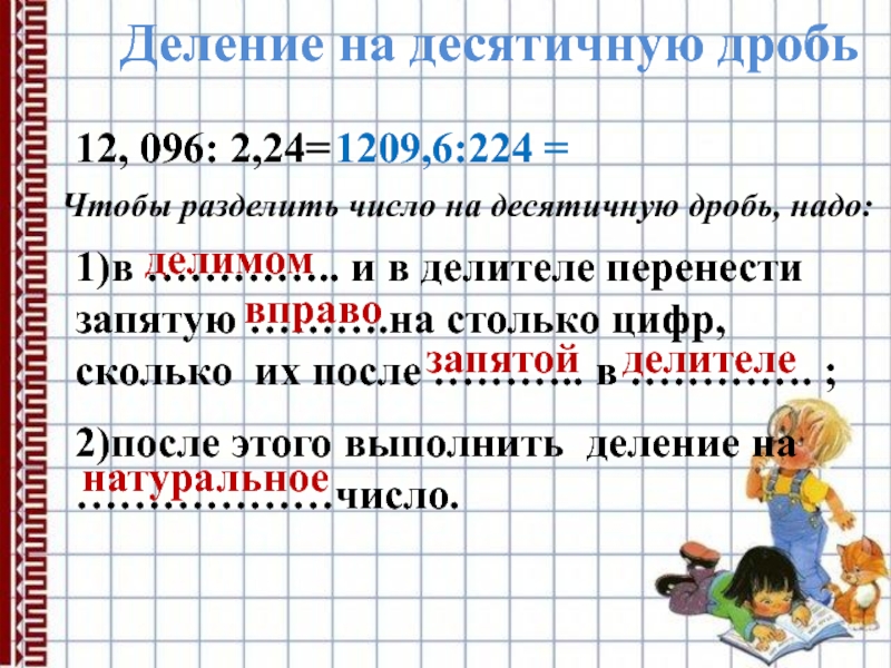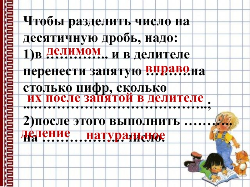 1)в ………….. и в делителе перенести запятую ……….на столько цифр, сколько их после ……….. в …………. ;