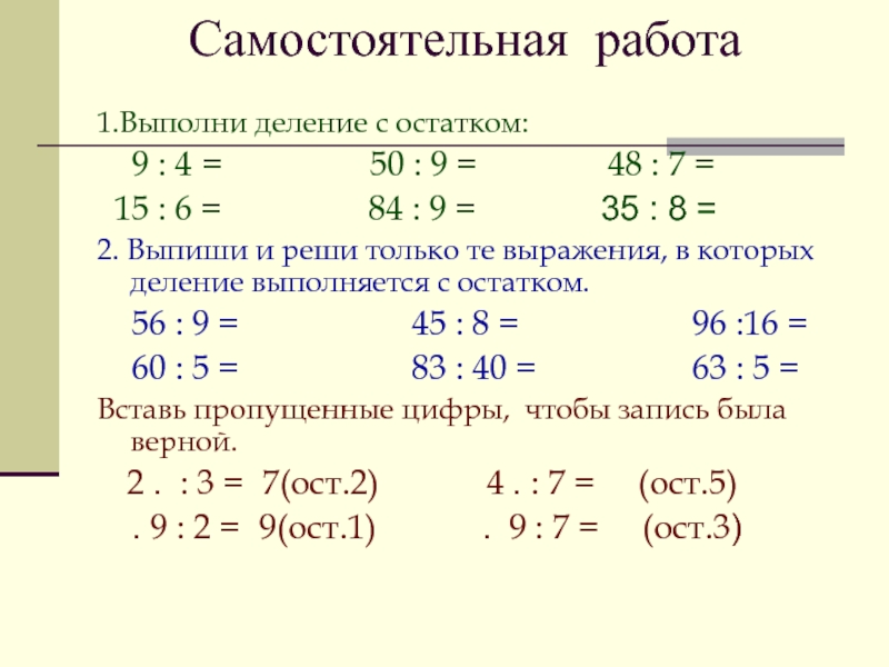 Самостоятельная работа1.Выполни деление с остатком:  9 : 4 =