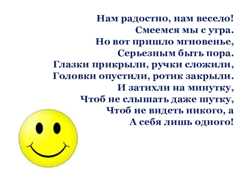 Слайд 1Нам радостно, нам весело!  Смеемся мы с утра.  Но вот пришло мгновенье,  Серьезным