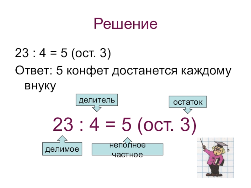 Решение23 : 4 = 5 (ост. 3)Ответ: 5 конфет достанется каждому внукуделимое23 : 4 = 5 (ост.