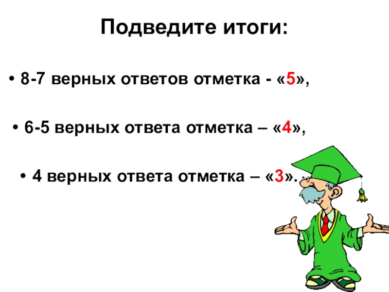 Подведите итоги: 8-7 верных ответов отметка - «5»,6-5 верных ответа отметка – «4»,4 верных ответа отметка –