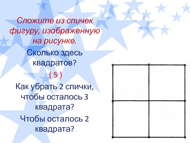 Сложите из спичек фигуру, изображенную на рисунке.Сколько здесь квадратов? ( 5 )Как убрать 2 спички, чтобы осталось