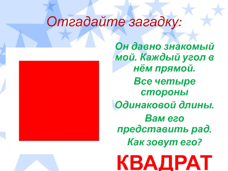 Отгадайте загадку: Он давно знакомый мой. Каждый угол в нём прямой. Все четыре стороны Одинаковой длины. Вам