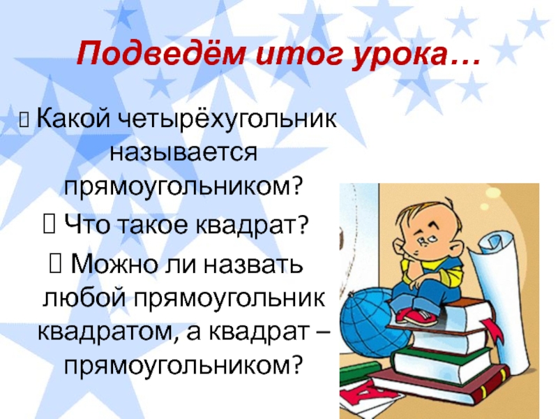 Подведём итог урока… Какой четырёхугольник называется прямоугольником? Что такое квадрат? Можно ли назвать любой прямоугольник квадратом, а