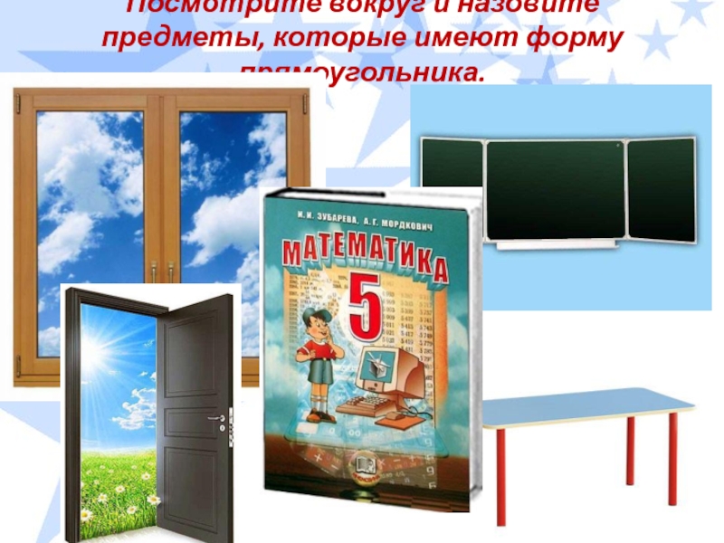 Посмотрите вокруг и назовите предметы, которые имеют форму прямоугольника.