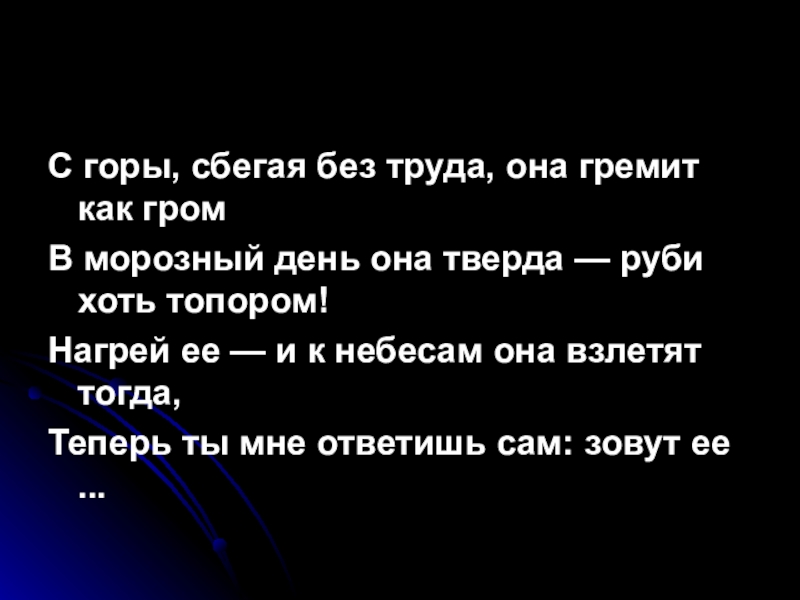 Слайд 16С горы, сбегая без труда, она гремит как гром