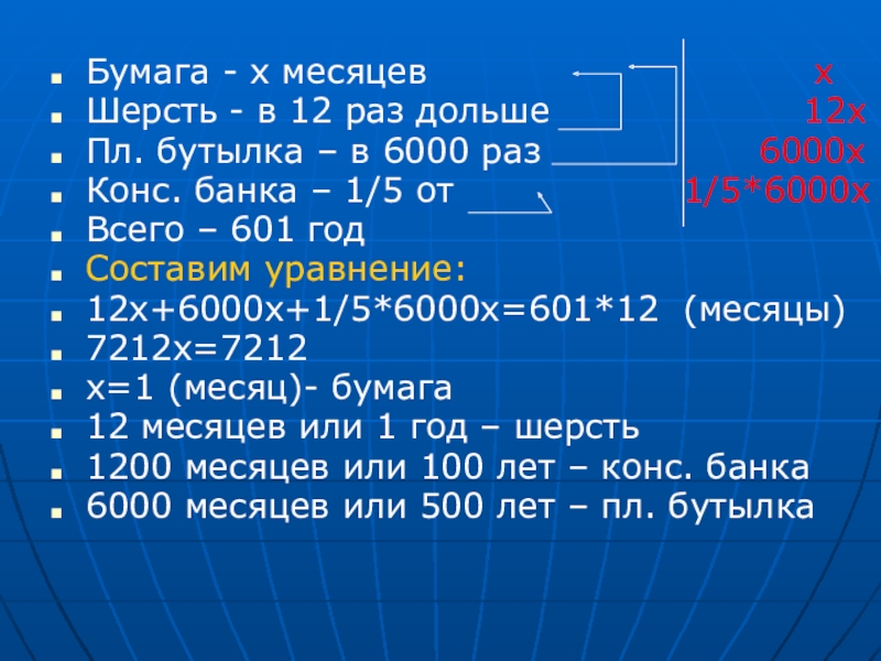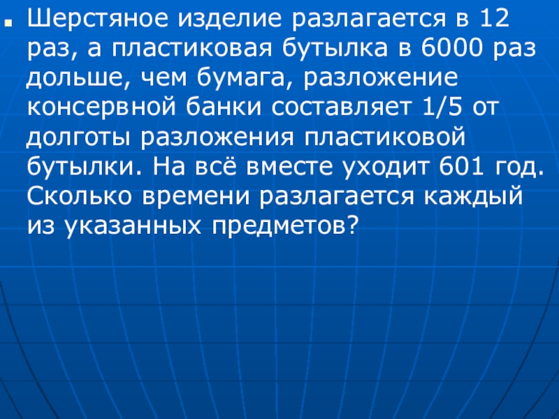 раз дольше, чем бумага, разложение консервной банки составляет 1/5 от долготы разложения пластиковой бутылки. На всё вместе уходит 601 год. Сколько времени разлагается каждый из указанных предметов?