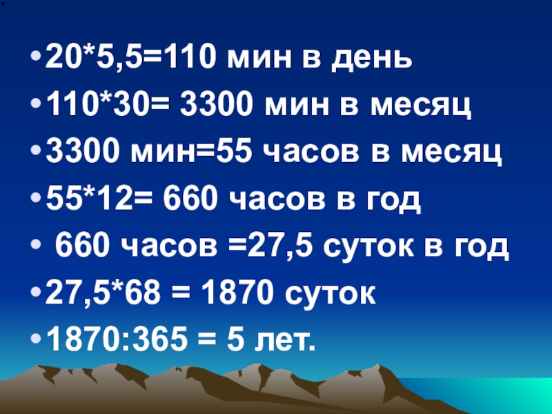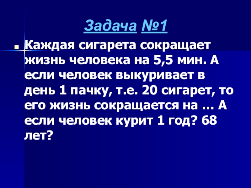 человек выкуривает в день 1 пачку, т.е. 20 сигарет, то его жизнь сокращается на … А если человек курит 1 год? 68 лет?