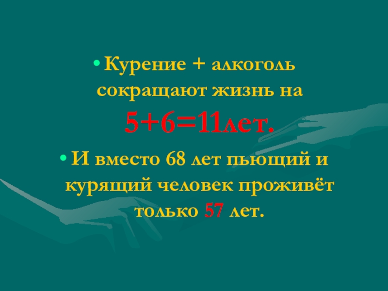 Слайд 13Курение + алкоголь сокращают жизнь на 5+6=11лет.