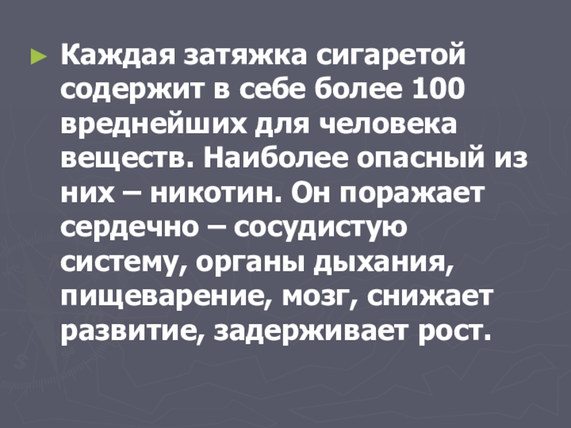 веществ. Наиболее опасный из них – никотин. Он поражает сердечно – сосудистую систему, органы дыхания, пищеварение, мозг, снижает развитие, задерживает рост.