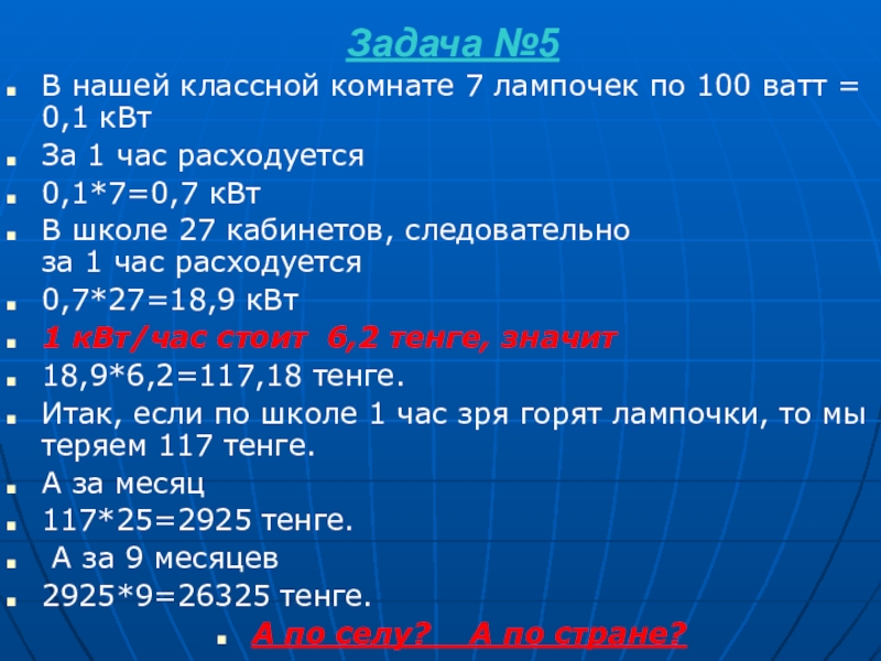 Итак, если по школе 1 час зря горят лампочки, то мы теряем 117 тенге.