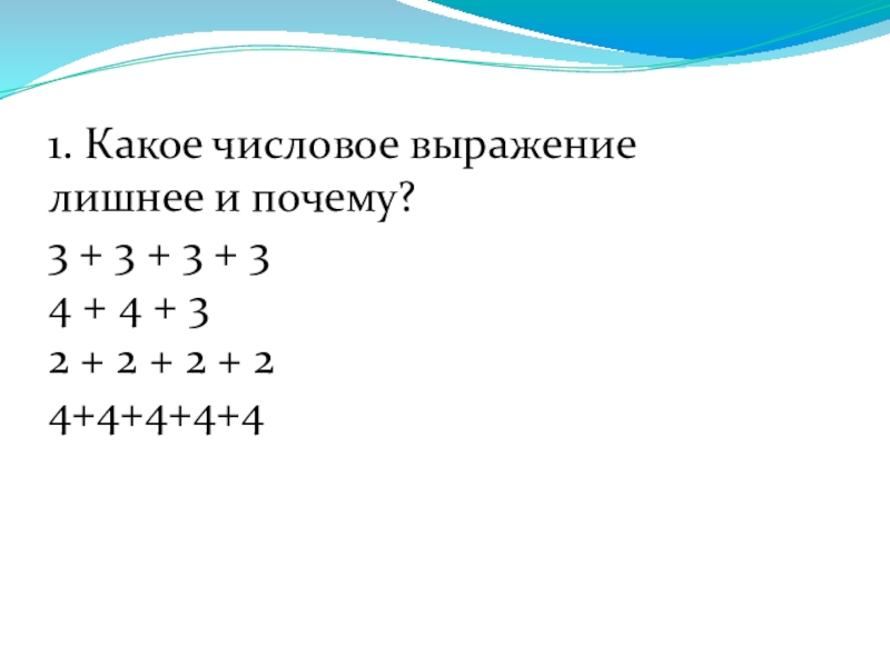 1. Какое числовое выражение лишнее и почему? 3 + 3 + 3 + 3 4 + 4