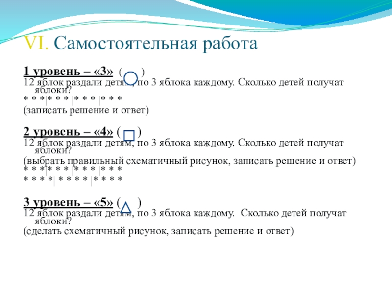 VI. Самостоятельная работа1 уровень – «3» (    )12 яблок раздали детям, по 3 яблока