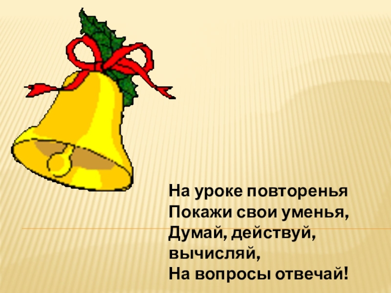 На уроке повтореньяПокажи свои уменья,Думай, действуй, вычисляй,На вопросы отвечай!