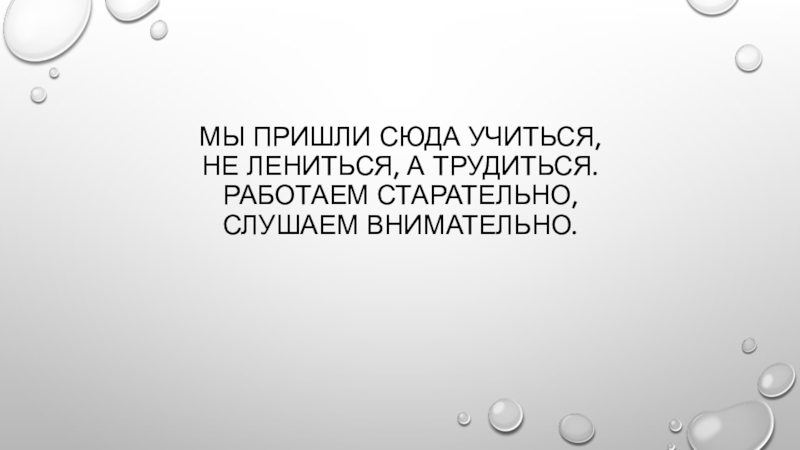 Слайд 1 Мы пришли сюда учиться, Не лениться, а трудиться. Работаем старательно, Слушаем внимательно.