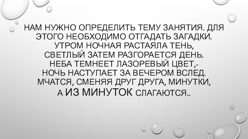 Нам нужно определить тему занятия. Для этого необходимо отгадать загадки. Утром ночная растаяла тень, Светлый затем разгорается день. Неба темнеет лазоревый цвет,- Ночь наступает за вечером вслед. Мчатся, сменяя