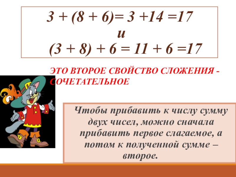 Чтобы прибавить к числу сумму двух чисел, можно сначала прибавить первое слагаемое, а потом к полученной сумме – второе.