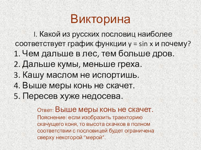 Пояснение: если изобразить траекторию скачущего коня, то высота скачков в полном соответствии с пословицей будет ограничена сверху некоторой “мерой”.