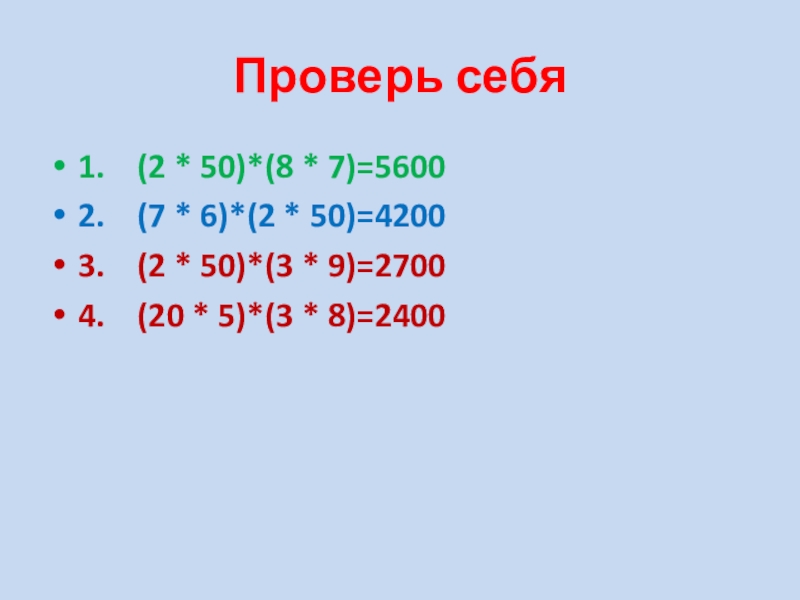 Проверь себя1.  (2 * 50)*(8 * 7)=56002.  (7 * 6)*(2 * 50)=42003.  (2 *
