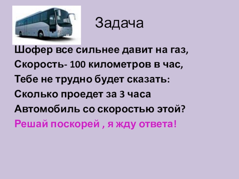 ЗадачаШофер все сильнее давит на газ,Скорость- 100 километров в час,Тебе не трудно будет сказать:Сколько проедет за 3