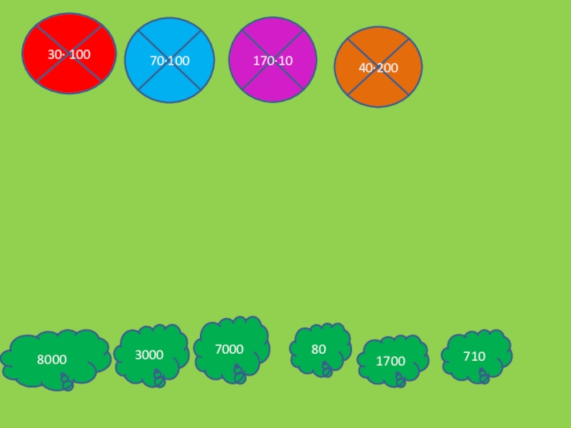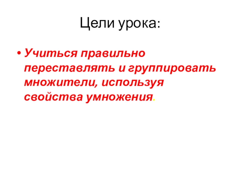 Цели урока:Учиться правильно переставлять и группировать множители, используя свойства умножения.