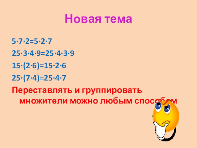 Новая тема5·7·2=5·2·725·3·4·9=25·4·3·915·(2·6)=15·2·625·(7·4)=25·4·7Переставлять и группировать множители можно любым способом