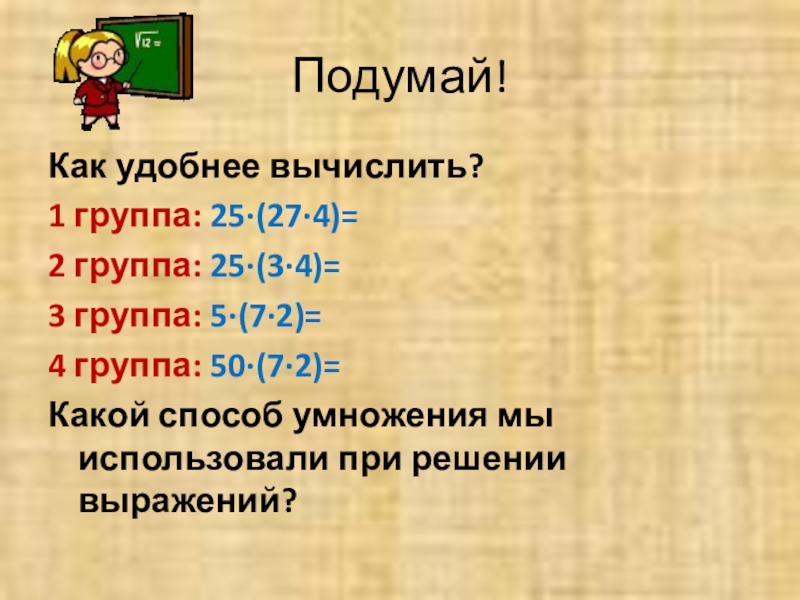 Подумай!Как удобнее вычислить?1 группа: 25·(27·4)=2 группа: 25·(3·4)=3 группа: 5·(7·2)=4 группа: 50·(7·2)=Какой способ умножения мы использовали при решении
