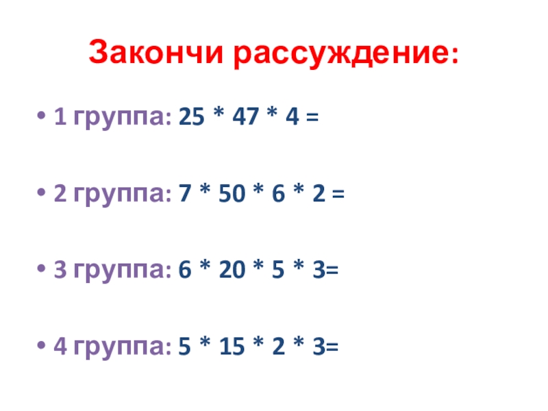 Закончи рассуждение:1 группа: 25 * 47 * 4 =2 группа: 7 * 50 * 6 * 2