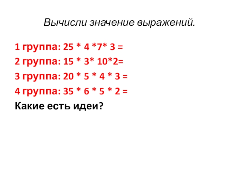 Вычисли значение выражений. 1 группа: 25 * 4 *7* 3 =2 группа: 15 * 3* 10*2=3 группа: