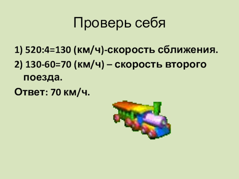 Проверь себя1) 520:4=130 (км/ч)-скорость сближения.2) 130-60=70 (км/ч) – скорость второго поезда.Ответ: 70 км/ч.