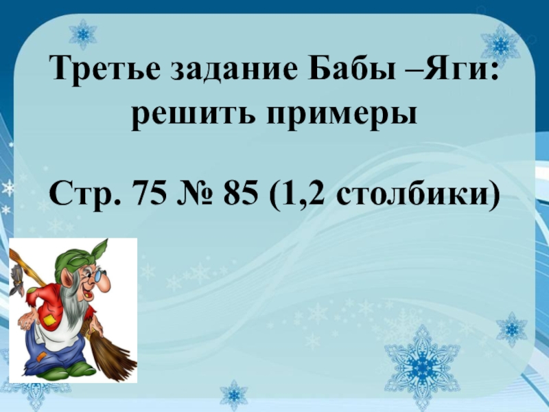 Третье задание Бабы –Яги: решить примерыСтр. 75 № 85 (1,2 столбики)
