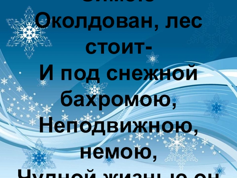 Слайд 2 Чародейкою Зимою Околдован, лес стоит- И под снежной бахромою, Неподвижною, немою, Чудной жизнью он блестит.