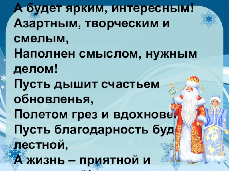 Слайд 18Пусть Новый год не станет пресным, А будет ярким, интересным! Азартным, творческим и