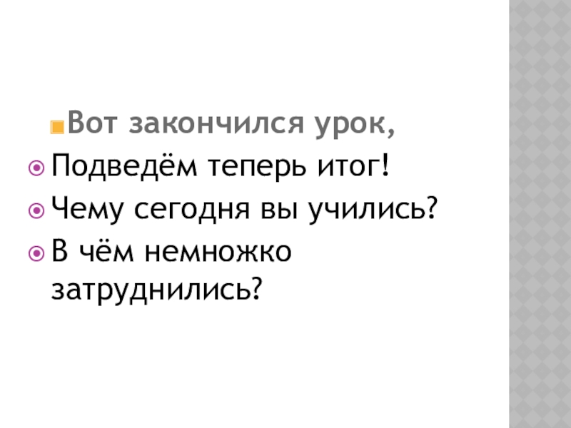 Вот закончился урок, Подведём теперь итог!Чему сегодня вы учились?В чём немножко затруднились?