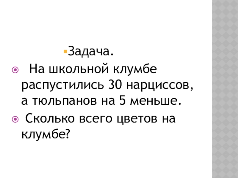Задача. На школьной клумбе распустились 30 нарциссов, а тюльпанов на 5 меньше. Сколько всего цветов на клумбе?