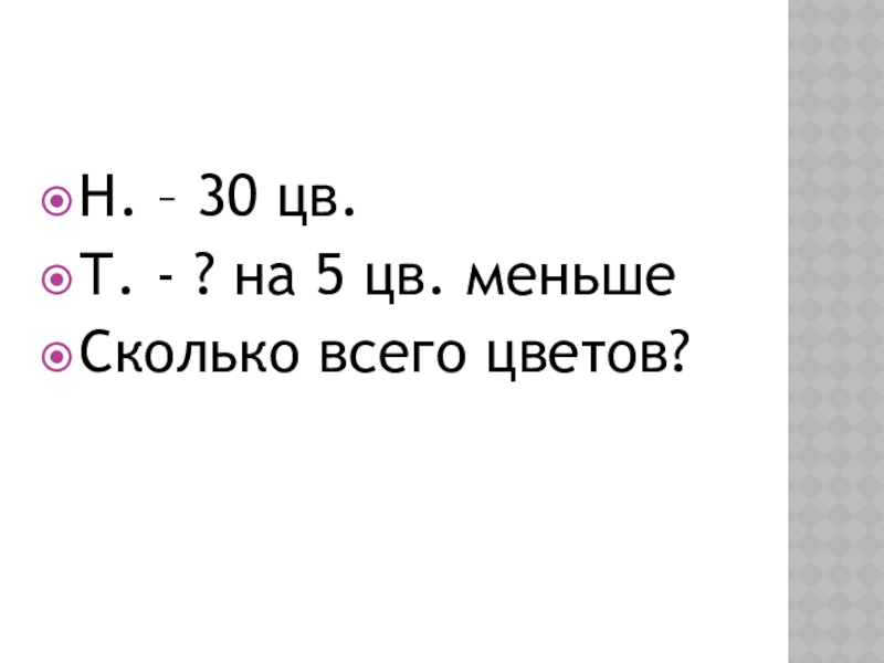 Н. – 30 цв.Т. - ? на 5 цв. меньшеСколько всего цветов?