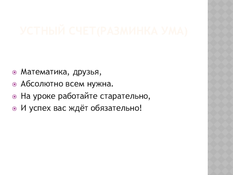 Устный счет(разминка ума)Математика, друзья,Абсолютно всем нужна.На уроке работайте старательно,И успех вас ждёт обязательно!