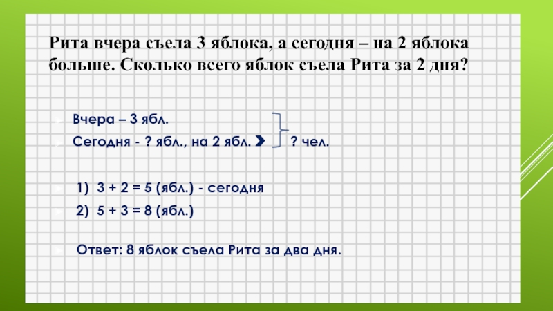 Рита вчера съела 3 яблока, а сегодня – на 2 яблока больше. Сколько всего яблок съела Рита за 2 дня?