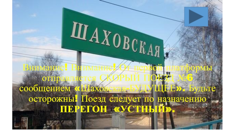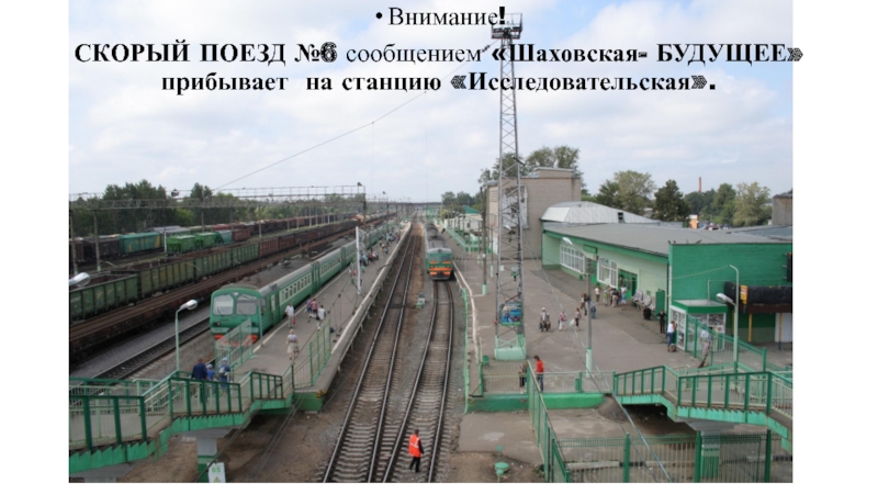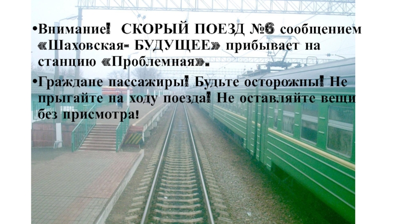 Слайд 11Внимание! СКОРЫЙ ПОЕЗД №6 сообщением «Шаховская- БУДУЩЕЕ» прибывает на станцию «Проблемная».