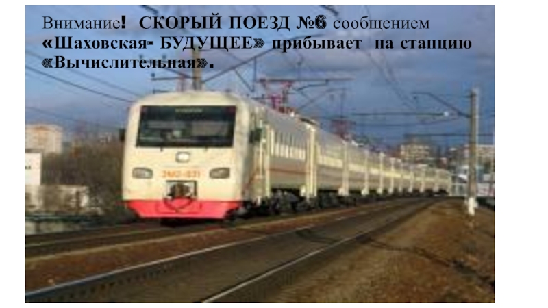 Слайд 16Внимание! СКОРЫЙ ПОЕЗД №6 сообщением «Шаховская- БУДУЩЕЕ» прибывает на станцию «Вычислительная».