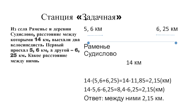 14-(5,6+6,25)=14-11,85=2,15(км)