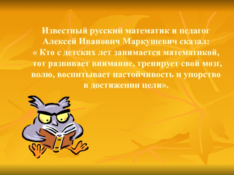 детских лет занимается математикой, тот развивает внимание, тренирует свой мозг, волю, воспитывает настойчивость и упорство в достижении цели».