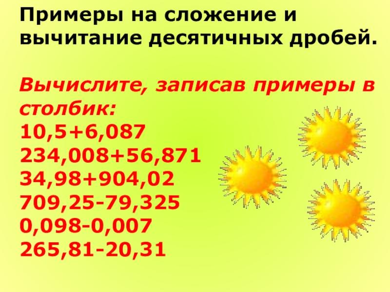 Слайд 10Примеры на сложение и вычитание десятичных дробей.