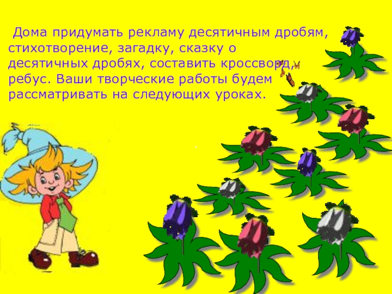 Дома придумать рекламу десятичным дробям, стихотворение, загадку, сказку о десятичных дробях, составить кроссворд, ребус. Ваши творческие